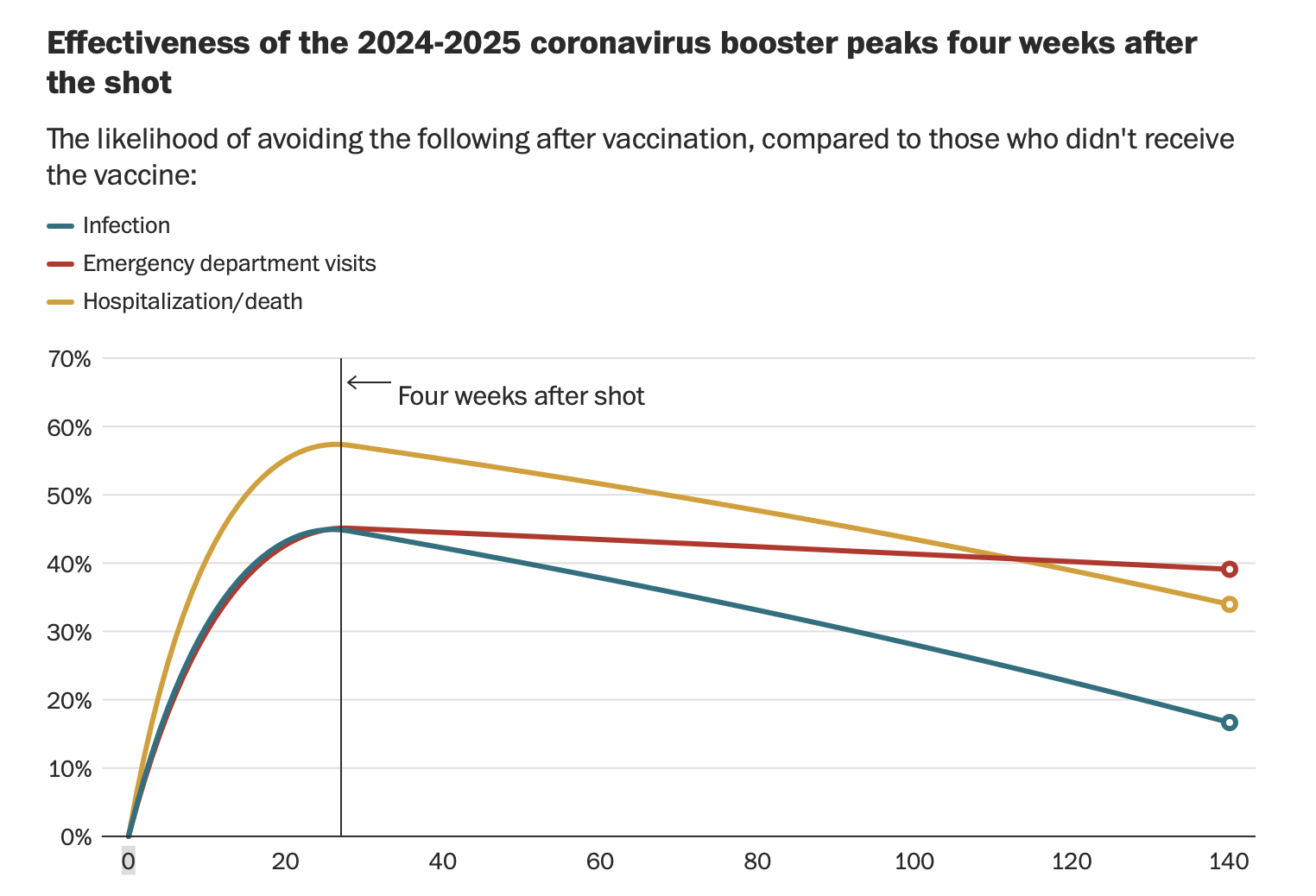 Protection against emergency visits followed a similar pattern, though it waned less: It was about 45 percent at four weeks, 43 percent at 10 and 39 percent at 20.